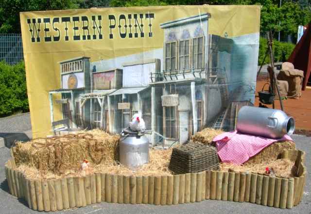 Viene allestito uno straordinario villaggio country (in caso di centro commerciale è possibile dividerlo in varie postazioni) dentro il quale i bimbi saranno coinvolti in giochi, degustazioni ed attività varie il cui tema è ovviamente il mitico West. Precisamente proponiamo l’avvincente postazione con il toro meccanico, il tepee indiano con trucca bimbi vestita a tema, tiro al bersaglio con fucili e pistola elettronica, il grande saloon delle delizie (degustazione zucchero filato e tortillas o fagioli messicani), i pannelli delle foto pazze. Ogni postazione è gestita da animatori vestiti da Cow Boy (o Cow Girl). Ad accogliere il pubblico all’interno del villaggio vi sarà un simpatico sceriffo trampoliere. La scenografia per questo evento è veramente straordinaria, costituita da elementi di grande impatto e da sorprendenti effetti dinamici di luce (cactus luminosi ecc.). Sono inoltre inclusi gadgets per tutti i partecipanti e stupendi premi per i vincitori. Nella versione “Big” è incluso in aggiunta un gonfiabile a tema Saloon, una postazione con western laboratorio o braccio di ferro, uno spettacolo con giochi a premi, baby dance ecc. effettuata dal temerario Luky Luke e una postazione “Wanted” nella quale i presenti potranno farsi fotografare e ricevere immediatamente la pergamena “Wanted” personalizzata con il proprio viso (ed eventualmente il logo dell’ente organizzatore). Impianto audio con musica country compreso nell’offerta
