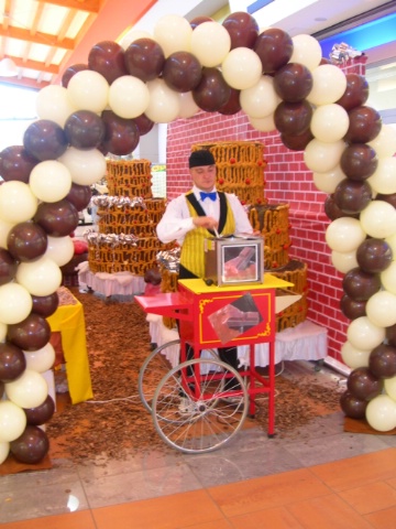 Questa produzione, sta riscontrando un ottimo successo (soprattutto nei centri commerciali), in quanto è dotata di un eccellente impatto scenico, e di un preannunciato e garantito coinvolgimento delle persone. La scenografia comprende 3 postazioni: - Postazione con zucchero filato al cioccolato - Postazione Crepes con nutella - Postazione Cioccolatini artigianali (i presenti avranno il piacere di prepararsi sul momento uno squisito cioccolatino utilizzando il composto liquido e gli stampini che il nostro maestro cioccolataio metterà a disposizione. Dopo qualche minuto il cioccolatino sarà pronto per essere gustato, con il valore aggiunto e la soddisfazione di averlo preparato con le proprie mani!)