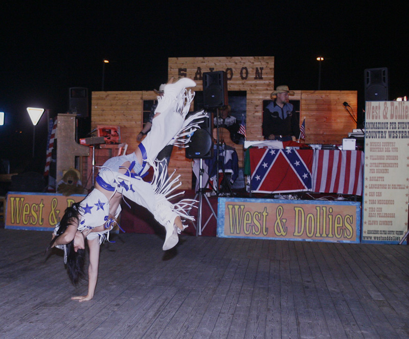 Indiani e Cow Boys si sfidano a colpi di fruste, rivoltelle e lanci di coltelli, al ritmo di musica country. Nelle versioni più complete si può includere il ballo can can e/o le indiane squaw che compiono riti di equilibrismo. Scenografia e Service audio inclusi.