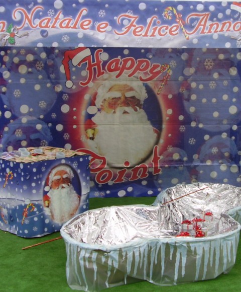 Un vero Luna Park nella citta’ di Babbo Natale, con straordinari addobbi e scenografie natalizie. - Postazione scenografica in cui il nostro animatore regalerà ai bambini dolci fiocchi di neve filata (zucchero filato). Allestimento di banchetto a tema natalizio compreso nella struttura! - Una postazione a tema natalizio per tiro ai barattoli - Una postazione per il divertentissimo gioco: “La minipesca dei regalini” OTTIMO IMPATTO SCENICO - REGALINI INCLUSI NB: Ogni postazione è gestita da un nostro animatore vestito a tema. A richiesta possiamo sostituire una o più postazioni con altre a scelta: minilaboratorio, miniquizzone natalizio, minipostazione videogiochi natalizi ecc.