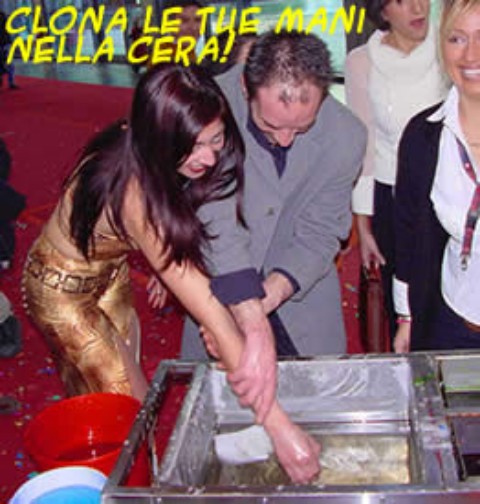 I nostri clienti sono i piu’ belli del mondo e per questo li cloniamo! Proprio cosi’, tramite uno speciale macchinario (unico in Italia) e’ possibile riprodurre immediatamente con la cera il calco della mano di ognuno, da poter conservare come ricordo indelebile. Possibilita’ di multicolorazione (colori della propria squadra o altro). Il procedimento e’ tanto semplice quanto affascinante: la persona (possono essere anche bambini!) immerge la mano in un contenitore di acqua ghiacciata, subito dopo nella cera tiepida che, facendo reazione, si indurira’ creando la clonazione. Per ottenere diverse colorazioni ripetere il procedimento più volte utilizzando le varie vasche colorate. Immaginate che ricordo portare a casa la mano del proprio bambino, da conservare fino a quando questi diverra’ adulto!