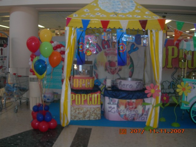 Una stupenda riproduzione di Luna park in cui vi saranno diverse postazioni: la “Pesca Delle Ochette” (Scenografia Laghetto), il “Lancio Dei Barattoli” con grande bersaglio scenografico (il bersaglio è rappresentato da un pannello raffigurante una grande faccia da clown avente al posto dei denti i … barattoli!), la postazione degustazione con zucchero filato e pop corn, la postazione del tiro al bersaglio, il mini gonfiabile (o miniparking con giochi di plastica), la Cartomante con postazione ecc. Ogni postazione è gestita da un animatore vestito a tema. La scenografia per questo evento è veramente di grande impatto, costituita da coloratissimi elementi e da sorprendenti effetti dinamici di luce (palme luminose ecc.). Sono inoltre inclusi gadgets per tutti i partecipanti e stupendi premi per i vincitori.