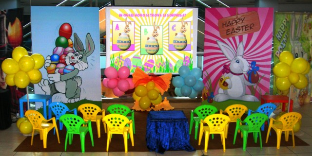 - Postazione Pasqua Fantasy: E’ caratterizzata da n°2 famosissimi giochi e precisamente il divertentissimo “Gioco delle coppie” (gioco di memoria) su un pannello scenografico con caselle a tema pasquale e il simpatico “coniglietto burlone” (gioco di mira), anch’ esso con pannello scenografico in cui un simpatico coniglio aspetta il concorrente che con un’abile lancio riesce a “riattaccargli” la coda che ha perso.