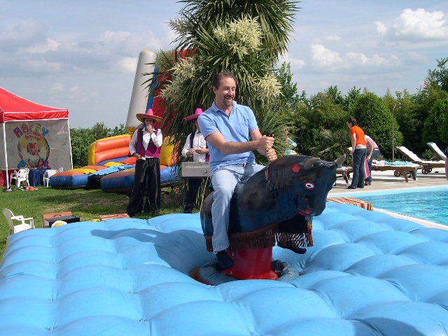 Un vero e proprio spettacolo di rodeo nel quale, grazie al nostro simulatore di toro, il pubblico potrà sfidarsi in una emozionante gara il cui obiettivo sarà di rimanere in sella il più possibile **. Nella versione più completa il miglior Cowboy vincerà uno stupendo soggiorno premio in alcune località esclusive del mondo. Un animatore, vestito da Cowboy, tramite battute, intermezzi comici ecc., trasformerà la gara di rodeo in una vera e propria festa country che coinvolgerà sia i protagonisti che il pubblico presente. Le scenografie, la musica ecc. creeranno l atmosfera delle vere feste americane divertita dalle numerose e spettacolari cadute dei concorrenti.
