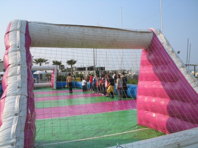 Il gioco del calcetto in una divertente soluzione: un bellissimo campo (disponibile in M 24x12 oppure m 18x10) realizzato in p.v.c. gonfiabile (comprese le porte) viene bagnato con acqua e sapone, rendendo la superficie scivolosa per i concorrenti. Lo speciale brevetto adottato per questa attrazione rende la nostra struttura estremamente sicura. Fornita completa di sapone (con certificazione di laboratorio), palloni, caschetti su richiesta, ecc. Ideale anche per bambini!