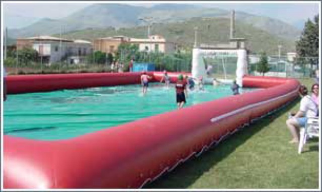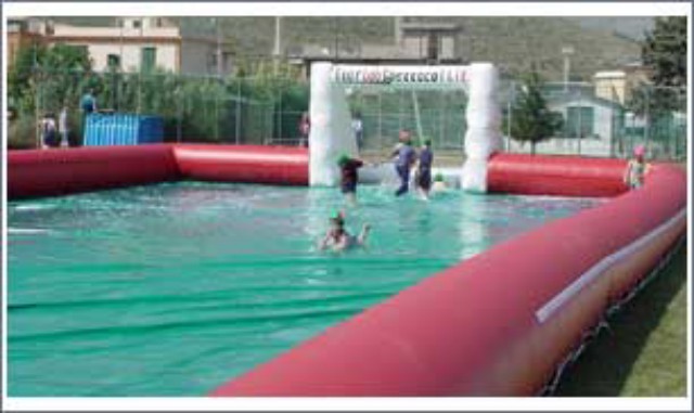 Il gioco del calcetto in una divertente soluzione: in un bellissimo campo (disponibile in M 24x12 oppure m 18x10) realizzato in p.v.c. gonfiabile (comprese le porte) viene aggiunta acqua fino a raggiungere l’altezza desiderata (minimo cm 5 per non consentire il rimbalzo della palla). L’acqua crea quella difficoltà di gioco (schizzi, corsa rallentata, mancanza di rimbalzo del pallone ecc.) che rende il gioco divertente e spettacolare. Fornita completa di palloni, caschetti su richiesta, ecc. Ideale anche per bambini!